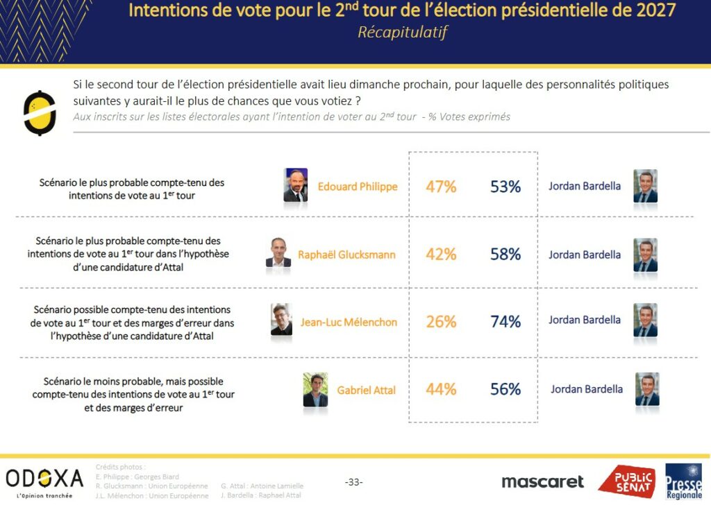 La montée de l’extrême droite en France constitue l’un des faits politiques majeurs mis en lumière par l’étude Odoxa. Pour la première fois, les simulations électorales indiquent une victoire systématique de son candidat dans l’ensemble des hypothèses de second tour testées, quels que soient les adversaires.